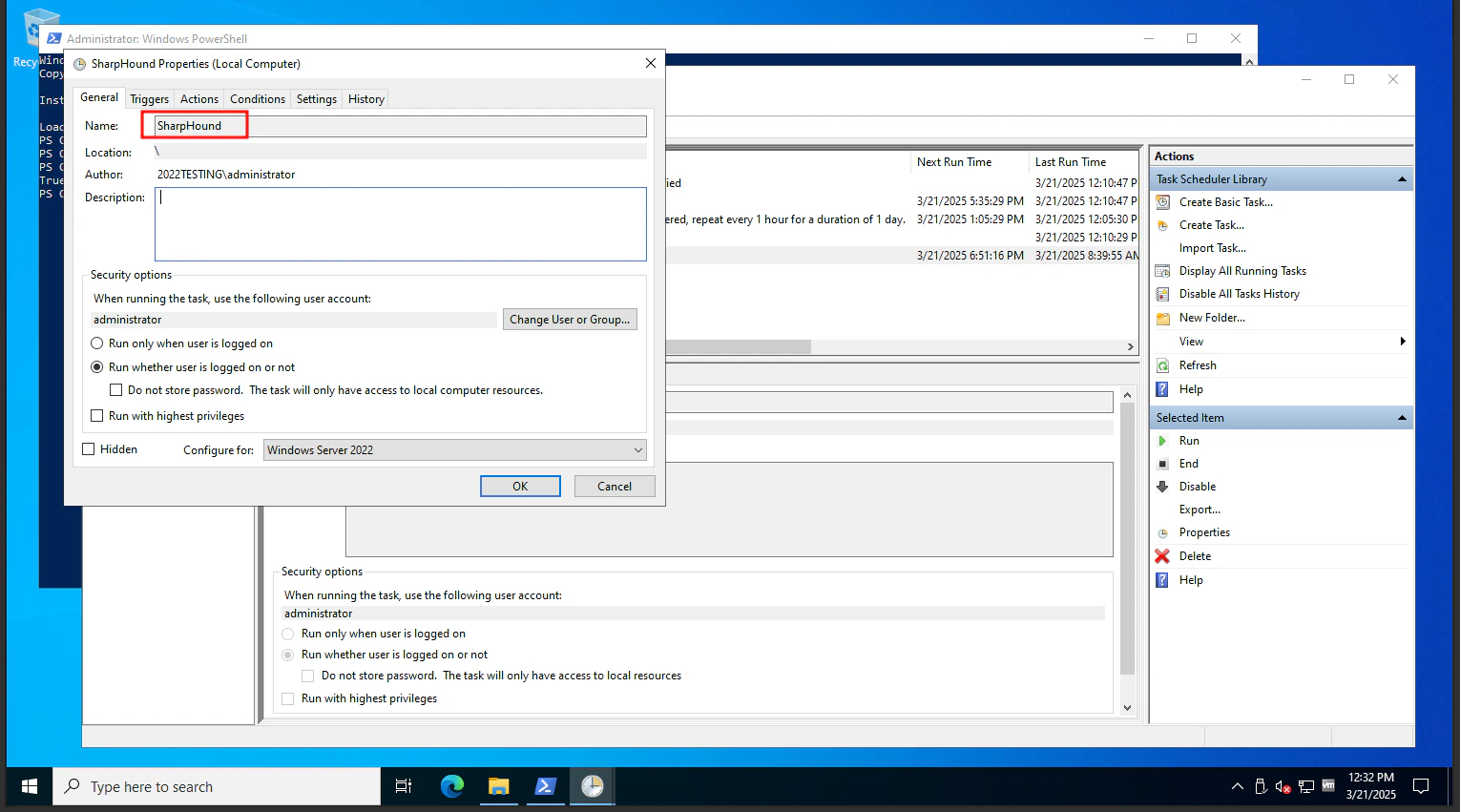 Open the Scheduled Tasks MSC on the SharpHound server and create a scheduled task. In the example shown below, the scheduled task name is SharpHound.
