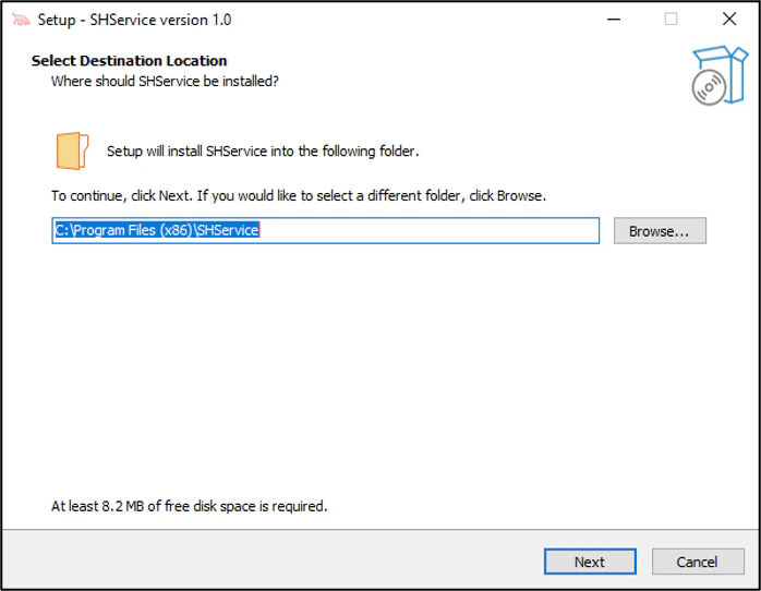 1. Choose where to install the service and click Next. We recommend a path protected from low-privileged user writes such as the default “C:\Program Files (x86)\SHService”.