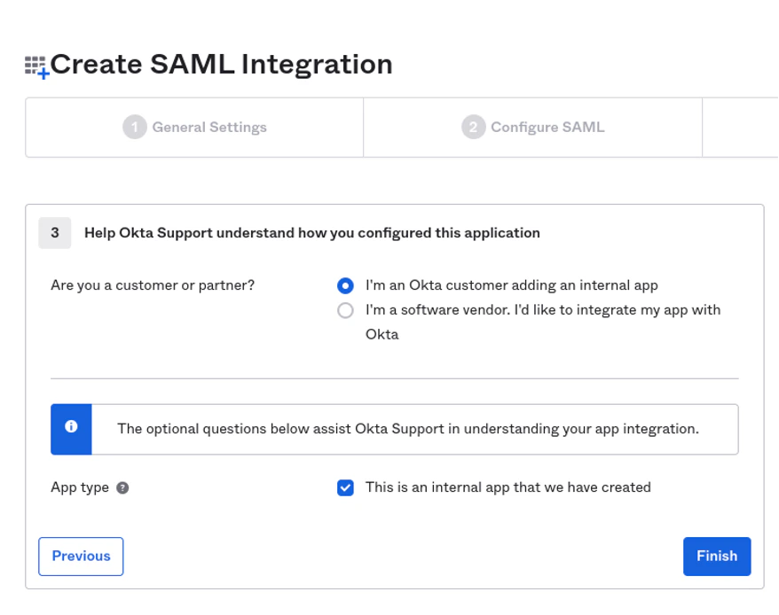 1. Complete creation of the SAML integration with the following options below: