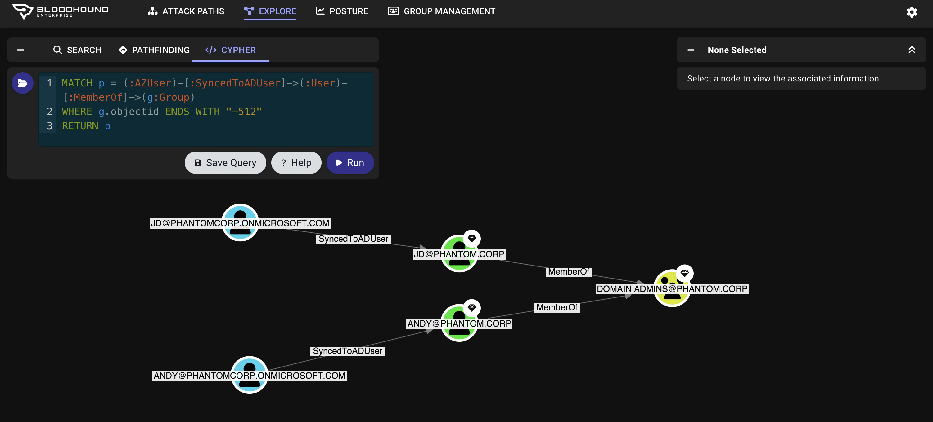 - New Attack Paths: Entra-AD User Syncing - Introduced to the BloodHound graph in April 2022 as a fully supported feature, Entra has remained a dissociated data set from AD. Ever since we’ve wanted to connect the graphs to show risk across those connection points. In this release, we’re adding coverage of user synchronization - showing where Entra and AD users are synced to each other across those environments. This release will enable users to identify and validate paths across those links via pathfinding and cypher. With this work complete, we’re starting a project in BloodHound Enterprise to measure the cross-platform risk from these paths!