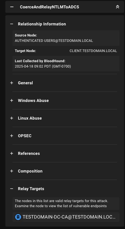 - CoerceAndRelayNTLMToADCS Relay Targets - Added a “Relay Targets” entity panel to the CoerceAndRelayNTLMToADCS edge type to provide the available relay targets for the Attack Path.
